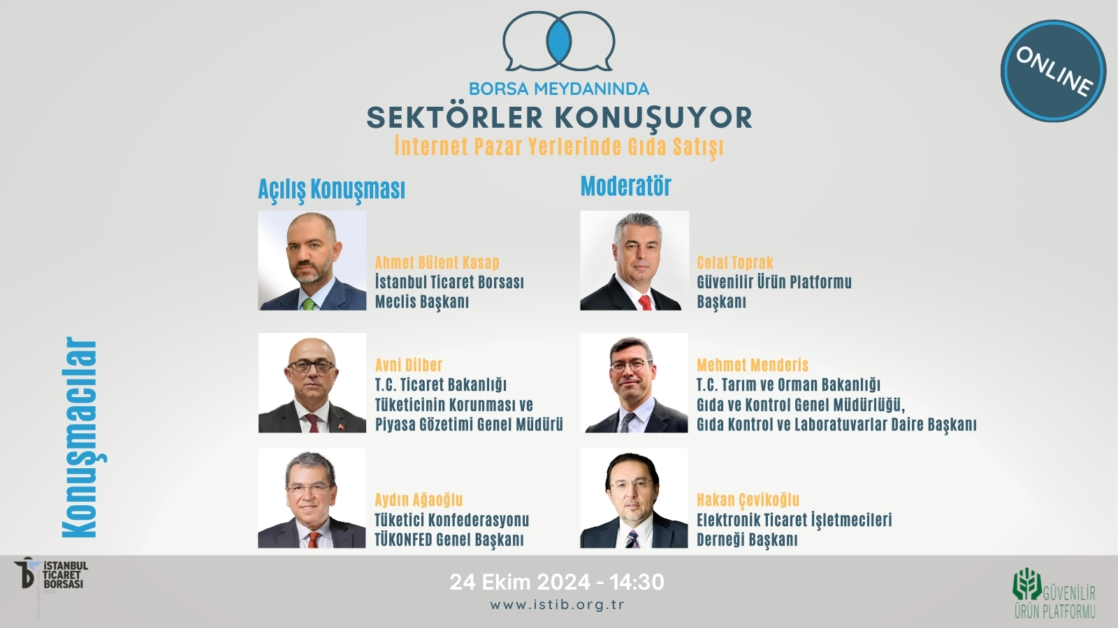 İnternette gıda satışının konuşulduğu etkinliğe, Ticaret Bakanlığı Tüketicinin Korunması ve Piyasa Gözetimi Genel Müdürü Avni Dilber, Tarım ve Orman Bakanlığı Gıda ve Kontrol Genel Müdürlüğü Gıda Kontrol ve Laboratuvarlar Daire Başkanı Mehmet Menderis, Tüketici Konfederasyonu (TÜKONFED) Genel Başkanı Aydın Ağaoğlu ve Elektronik Ticaret İşletmecileri Derneği Başkanı Hakan Çevikoğlu konuşmacı olarak katıldı. Açılış konuşmasını İstanbul Ticaret Borsası Meclis Başkanı Ahmet Bülent Kasap’ın gerçekleştirdiği toplantının moderatörlüğünü ise Güvenilir Ürün Platformu Başkanı Gazeteci Celal Toprak yaptı.
