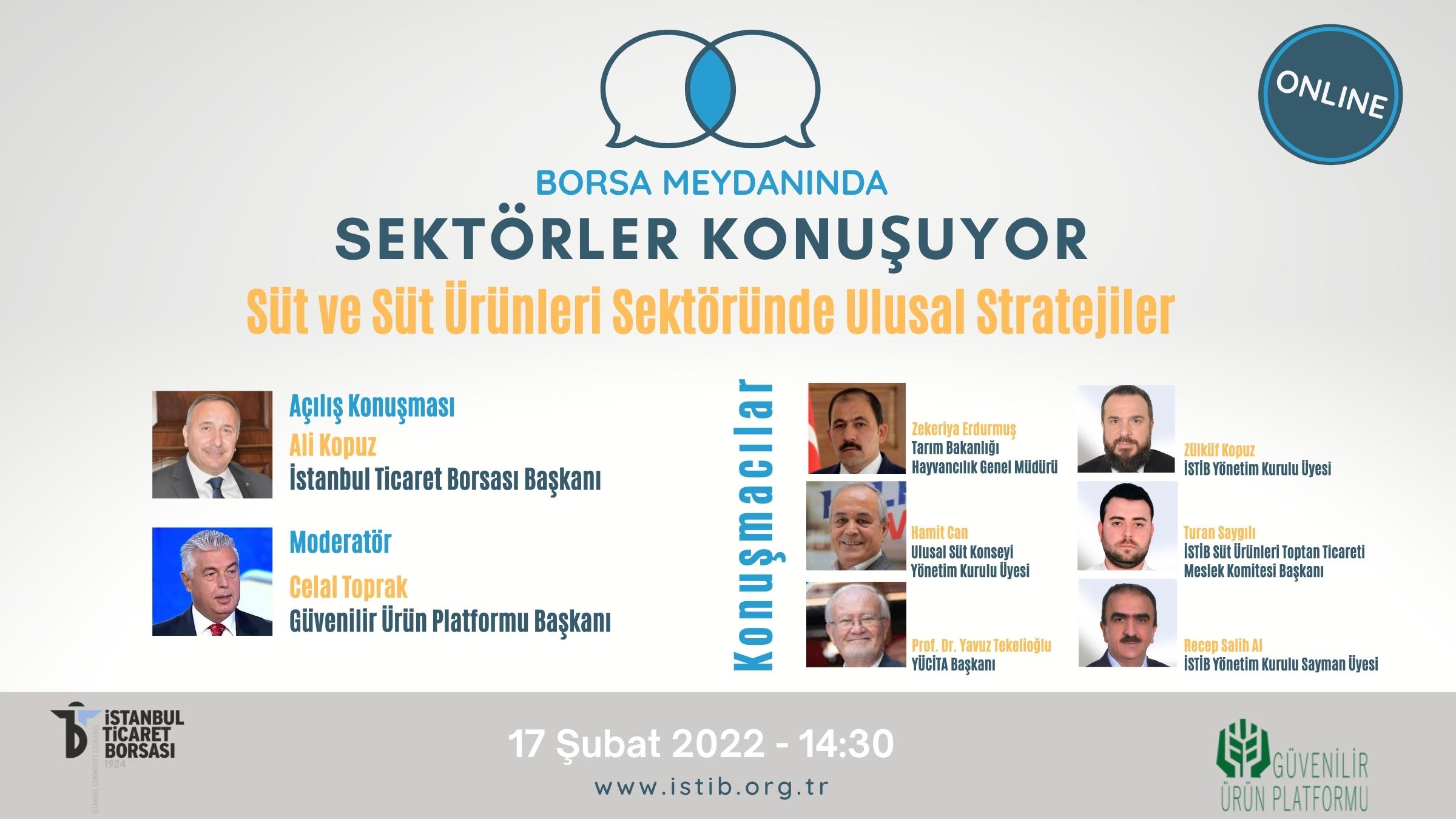 İstanbul Ticaret Borsası’nın düzenlediği ‘Borsa Meydanı’nda Sektörler Konuşuyor’ toplantılarının ikincisinde süt ve süt ürünleri sektörünün sorunları konuşuldu. 17 Şubat Perşembe günü webinar ortamında gerçekleştirilen, Süt ve Süt Ürünlerinde Ulusal Stratejiler başlıklı toplantıya Tarım ve Orman Bakanlığı Hayvancılık Genel Müdürü Zekeriya Erdurmuş, Ulusal Süt Konseyi Yönetim Kurulu Üyesi Hamit Can, Yöresel Ürünler ve Coğrafi İşaretler Türkiye Araştırma Ağı (YÜCİTA) Başkanı Prof. Dr. Yavuz Tekelioğlu, Gündoğdu Gıda Yönetim Kurulu Başkanı ve İSTİB Yönetim Kurulu Üyesi Zülküf Kopuz, İSTİB Süt Ürünleri Toptan Ticareti Meslek Komitesi Başkanı Turan Saygılı ve İSTİB Yönetim Kurulu Sayman Üyesi ve Süt Ürünleri Perakende Ticareti Komitesi Üyesi Recep Salih Al konuşmacı olarak katıldı.