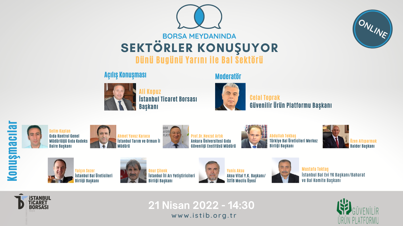İstanbul Ticaret Borsası’nın düzenlediği ‘Borsa Meydanı’nda Sektörler Konuşuyor’ toplantılarının dördüncüsünde bal sektörünün sorunları konuşuldu. 21 Nisan Perşembe günü webinar ortamında gerçekleştirilen, “Dünü Bugünü Yarını ile Bal Sektörü” başlıklı toplantıya; Gıda Kontrol Genel Müdürlüğü Gıda Kodeks Daire Başkanı Selim Kaplan, İstanbul Tarım ve Orman İl Müdürü Ahmet Yavuz Karaca, Ankara Üniversitesi Gıda Güvenliği Enstitüsü Müdürü Prof. Dr. Nevzat Artık, Altıparmak Gıda Yönetim Kurulu Başkanı ve Balder Başkanı Özen Altıparmak, İstanbul Bal Üreticileri Birliği Başkanı Yalçın Sezer, İstanbul İli Arı Yetiştiricileri Birliği Başkanı Onur Çilenk, Aksu Vital Yönetim Kurulu Başkanı ve İSTİB Meclis Üyesi Yunis Aksu, İstanbul Bal Evi Yönetim Kurulu Başkanı ve İSTİB Bal ve Baharat Komitesi Başkanı Mustafa Toktaş konuşmacı olarak katıldı.
