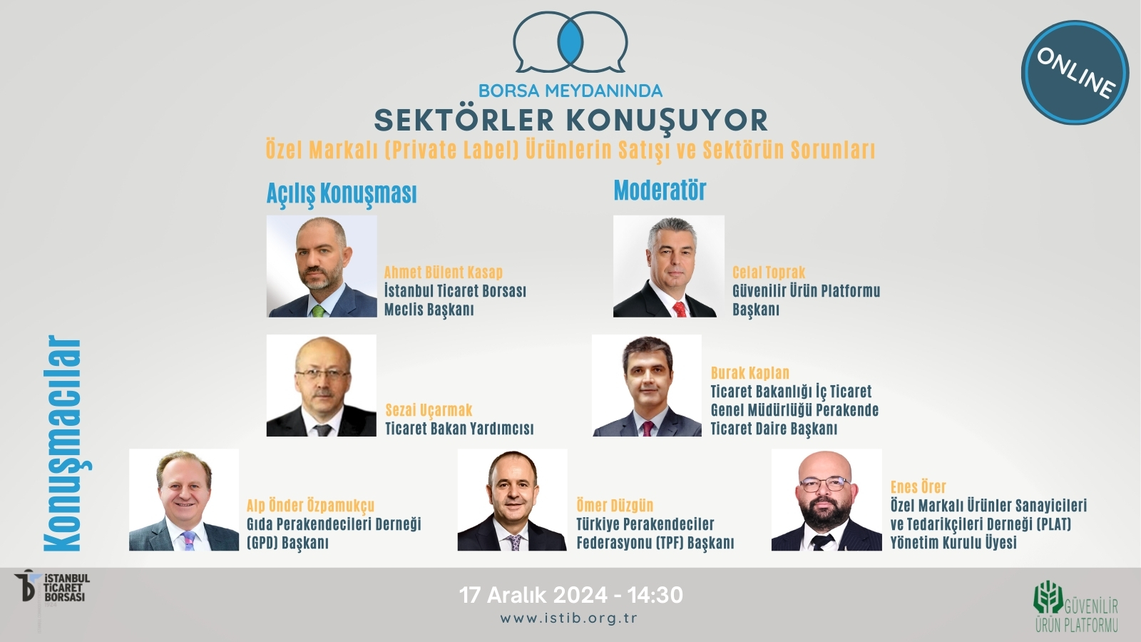 Online olarak yapılan toplantının açılış konuşmasını İstanbul Ticaret Borsası Meclis Başkanı Ahmet Bülent Kasap, moderatörlüğünü ise gazeteci Celal Toprak yaptı. “Özel Markalı (Private Label) Ürünlerin Satışı ve Sektörün Sorunları” başlıklı etkinliğe; Ticaret Bakanı Yardımcısı Sezai Uçarmak, Ticaret Bakanlığı İç Ticaret Genel Müdürlüğü Perakende Ticaret Daire Başkanı Burak Kaplan, Gıda Perakendecileri Derneği (GPD) Başkanı Alp Önder Özpamukçu, Türkiye Perakendeciler Federasyonu (TPF) Başkanı Ömer Düzgün, Özel Markalı Ürünler Sanayicileri ve Tedarikçileri Derneği (PLAT) Yönetim Kurulu Üyesi Enes Örer konuşmacı olarak katıldı.