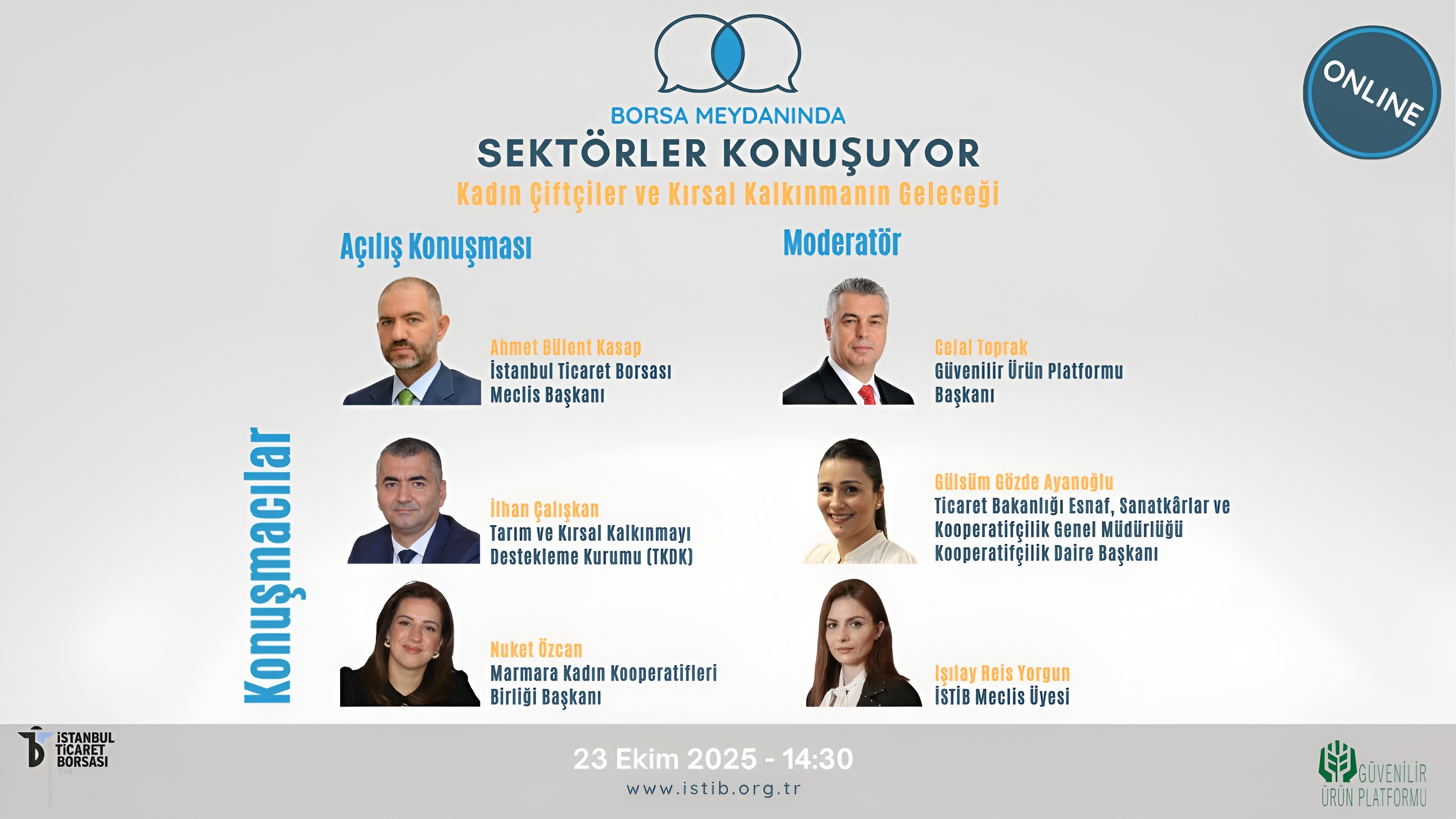 Açılış konuşmasını İstanbul Ticaret Borsası Meclis Başkanı Ahmet Bülent Kasap, moderatörlüğünü ise gazeteci Celal Toprak’ın yaptığı toplantıya, Tarım ve Kırsal Kalkınmayı Destekleme Kurumundan İlhan Çalışkan, Ticaret Bakanlığı Esnaf, Sanatkârlar ve Kooperatifçilik Genel Müdürlüğü Kooperatifçilik Daire Başkanı Gülsüm Gözde Ayanoğlu, Marmara Kadın Kooperatifleri Birliği Başkanı Nuket Özcan ve İstanbul Ticaret Borsası Meclis Üyesi Işılay Reis Yorgun konuşmacı olarak katıldı.