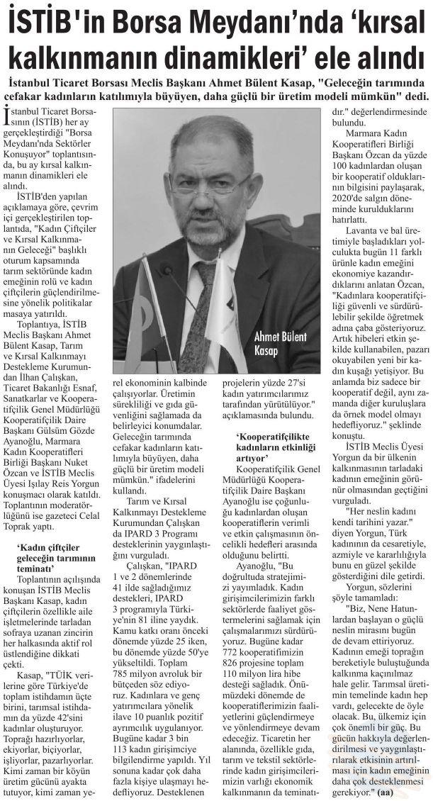 İstanbul Ticaret Borsası Meclis Başkanı Ahmet Bülent Kasap, toplantının açılış konuşmasında; kadın çiftçilerimizin, özellikle aile işletmelerinde tarladan sofraya uzanan zincirin her halkasında aktif rol üstlendiğine dikkat çekerek, “TÜİK verilerine göre Türkiye’de toplam istihdamın 3’te 1’ini, tarımsal istihdamın da yüzde 42’sini kadınlar oluşturuyor. Toprağı hazırlıyorlar, ekiyorlar, biçiyorlar, işliyorlar, pazarlıyorlar… Kimi zaman bir köyün üretim gücünü ayakta tutuyor, kimi zaman yerel ekonominin kalbinde çalışıyorlar. Üretimin sürekliliği ve gıda güvenliğini sağlamada da belirleyici konumdalar. Geleceğin tarımında cefakâr kadınların katılımıyla büyüyen, daha güçlü bir üretim modeli mümkün” dedi.